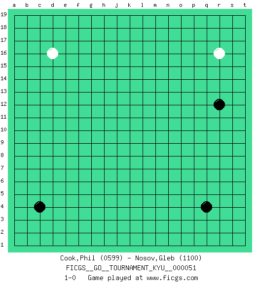 Last move : 1-0 2008 January 7 22:50:53 [Event "FICGS__GO__TOURNAMENT_KYU__000051"] [Site "FICGS"] [Date "2007.12.03"] [Round "1"] [Black "Cook,Phil"] [White "Nosov,Gleb"] [Result "1-0"] [Rating 1 "0599"] [Rating 2 "1100"] 1.q4 r16 2.c4 d16 3.r12 1-0 This go game has been lost on time (started : 2007.12.03 18:58:45) Here are the names of the openings (joseki) played in the four corners : Corner q16 : r16 r12 Komoku (Somok, Xiao~mu`) 3-4 Point. The komoku (3-4) point is the traditional corner enclosure move.. Corner q4 : q4 1-0 Hoshi (Hwajeom, Seongjeom, Xingwei`) 4-4 Point. The star or hoshi (4-4) point, emphasizing influence at the potential expense of territory. Player Black won this Go (weiqi, baduk) game. Follow this game move after move (download)To emphasize the lack of determination in his moves, one speaks of chance. (Pierre Audouard) Real knowledge is to know the extent of one's ignorance. (Confucius)
