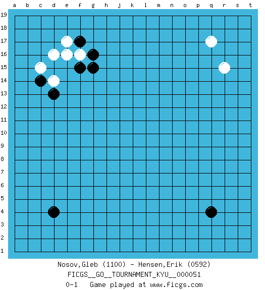 Last move : 0-1 2008 January 12 11:6:37 [Event "FICGS__GO__TOURNAMENT_KYU__000051"] [Site "FICGS"] [Date "2007.12.03"] [Round "1"] [Black "Nosov,Gleb"] [White "Hensen,Erik"] [Result "0-1"] [Rating 1 "1100"] [Rating 2 "0592"] 1.d4 q17 2.q4 d16 3.c14 r15 4.f17 f16 5.g16 e17 6.f15 e16 7.g15 d14 8.d13 c15 0-1 This go game has been lost on time (started : 2007.12.03 18:58:45) Here are the names of the openings (joseki) played in the four corners : Corner d16 : d16 c14 Hoshi (Hwajeom, Seongjeom, Xingwei`) 4-4 Point. The star or hoshi (4-4) point, emphasizing influence at the potential expense of territory. Ikken Kakari (Hankan Keolch'im, Yi Gua`jiao~, 1-Space Low Approach). Black 2 is the standard approach move to the 4-4. Player White won this Go (weiqi, baduk) game. Follow this game move after move (download)The L-group is dead. (Anonymous) A good programmer is someone who always looks both ways before crossing a one-way street. (Doug Linder)