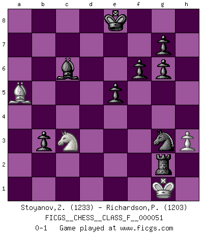 Last move : 0-1 2007 December 16 21:29:25 [Event "FICGS__CHESS__CLASS_F__000051"] [Site "FICGS"] [Date "2007.12.04"] [Round "1"] [White "Stoyanov,Zdravko"] [Black "Richardson,Patrick"] [Result "0-1"] [WhiteElo "1233"] [BlackElo "1203"] 1.e4 Nf6 2.e5 Nd5 3.Bc4 Nb6 4.Bb3 c5 5.Qf3 c4 6.d4 cxb3 7.axb3 d6 8.Be3 Nc6 9.exd6 Qxd6 10.Ne2 Qg6 11.d5 Nb4 12.O-O Bg4 13.Nf4 Bxf3 14.Nxg6 hxg6 15.Bxb6 Nxc2 16.Ra4 Bxd5 17.b4 Rh4 18.Rd1 Rxb4 19.Rxa7 Rxa7 20.Bxa7 Rxb2 21.Nc3 Bc6 22.Bb8 b5 23.Bc7 f6 24.h3 b4 25.Ne2 b3 26.Nc3 e5 27.Kh2 Nd4 28.Kg3 Nf5+ 29.Kh2 Rxf2 30.Rg1 Rc2 31.Ba5 Bc5 32.Kh1 Ng3+ 33.Kh2 Bxg1+ 34.Kxg1 Rxg2+ 0-1 Alekhine's defense Kingside Castling by player White (move 12) Player Black won this chess game. Follow this game move after move (download)When I have White, I win because I am white; When I have Black, I win because I am Bogolyubov. (Bogolyubov) Jede Eröffnung ist gut genug um gespielt zu werden, wenn nur ihr Ruf schlecht genug ist. (Savielly Grigorievitsch Tartakower) En el Ajedrez, cuando menos, el valiente hereda la tierra. (Edmar Mednis) Un journaliste : 'Vous préférez avoir une dame de plus sur l'échiquier ou au lit ?' Boris Spassky : 'Ca dépend de la position.' In theory there is no difference between theory and practice. In practice there is. (Yogi Berra)