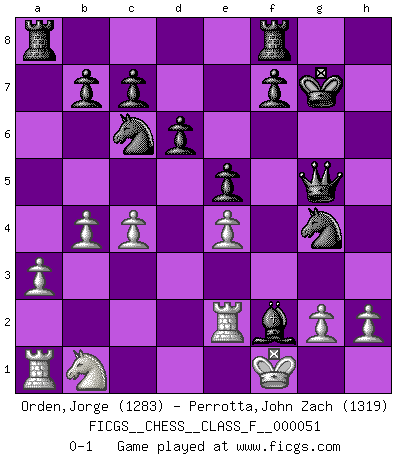Last move : 0-1 2008 February 22 18:25:46 [Event "FICGS__CHESS__CLASS_F__000051"] [Site "FICGS"] [Date "2007.12.04"] [Round "1"] [White "Orden,Jorge"] [Black "Perrotta,John Zach"] [Result "0-1"] [WhiteElo "1283"] [BlackElo "1319"] 1.e4 e5 2.Nf3 Nc6 3.Bc4 Nf6 4.d3 Bc5 5.O-O O-O 6.Re1 d6 7.Bg5 h6 8.Bh4 Be6 9.c3 Bxc4 10.dxc4 a5 11.a3 g5 12.Nxg5 hxg5 13.Bxg5 Kg7 14.b4 axb4 15.cxb4 Bd4 16.Qg4 Bxf2+ 17.Kf1 Nxg4 18.Re2 Qxg5 0-1 Two knights defense (Modern Bishop's Opening) Kingside Castling by player White (move 5) Kingside Castling by player Black (move 5) Player Black won this chess game. Follow this game move after move (download)When you don't know what to play, wait for an idea to come into your opponent's mind. You may be sure that idea will be wrong. (Siegbert Tarrasch) Es gibt nur zwei wahre Schachgenies - das andere war Wilhelm Steinitz, der Weltmeister von 1872 bis 1894. (Robert James Fischer) Solo existe una cosa que Fischer hace en el Ajedrez sin placer: ¡perder!. (Boris Spassky) Il n'y a pas de prix trop élevé au scalp de l'ennemi. (Koblentz) When I took office, only high energy physicists had ever heard of what is called the World Wide Web... Now even my cat has its own page. (Bill Clinton, 1996)