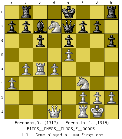 Last move : 1-0 2008 March 24 4:59:42 [Event "FICGS__CHESS__CLASS_F__000051"] [Site "FICGS"] [Date "2007.12.04"] [Round "1"] [White "Barradas,Anderson"] [Black "Perrotta,John Zach"] [Result "1-0"] [WhiteElo "1312"] [BlackElo "1319"] 1.d4 d5 2.c4 c6 3.Nc3 Nf6 4.Nf3 e6 5.Bg5 dxc4 6.e4 h6 7.Bxf6 Qxf6 8.Bxc4 Bb4 9.e5 Qe7 10.O-O Nd7 11.a3 Ba5 12.b4 Bc7 13.Ne4 Nb6 14.Rc1 Nxc4 15.Rxc4 Bd7 16.Nc5 Rb8 17.Nxd7 1-0 This chess game has been lost on time (started : 2007.12.04 9:50:54) QGD Slav defense Kingside Castling by player White (move 10) Player White won this chess game. Follow this game move after move (download)I thought the most common mistake [in chess] was the first one: Learning the game :P (Garvin Gray, FICGS forum) Schach ist ein Teil der Kultur, und wenn es mit der Kultur abwärts geht, geht es auch mit dem Schach abwärts. (Mikhail Moiseyevich Botvinik) El Ajedrez es un expediente tonto que hace creer a la gente inactiva que hacen una cosa muy astuta cuando solamente estan perdiendo su tiempo. (George Bernard Shaw) On entre au jeu d'Echecs comme on entre en Religion. Pour le joueur d'Echecs, la partie d'Echecs c'est l'office, la messe, le défilé du 1er Mai, le dépôt de gerbe au Monument aux Morts. C'est un drame sacré. (Michel Roos) The bottom line is always the bottom line. (Johann Piek)