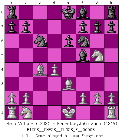 Last move : 1-0 2008 February 5 0:40:42 [Event "FICGS__CHESS__CLASS_F__000051"] [Site "FICGS"] [Date "2007.12.04"] [Round "1"] [White "Hess,Volker"] [Black "Perrotta,John Zach"] [Result "1-0"] [WhiteElo "1242"] [BlackElo "1319"] 1.e4 c5 2.c3 d5 3.exd5 Qxd5 4.d4 cxd4 5.Qxd4 Qxd4 6.cxd4 Bf5 7.Nf3 Nf6 8.Bc4 Nc6 9.Ng5 e6 10.Be3 1-0 This chess game has been lost on time (started : 2007.12.04 9:50:54) Sicilian : Alapin's variation (2.c3) Player White won this chess game. Follow this game move after move (download)The defensive power of a pinned piece is only imaginary. (Aaron Nimzovich) Ich bewundere Kasparows phantasievolle Angriffssiege aus den Achtzigern und Neunzigern, aber wenn man sie mit dem Computer überprüft, nimmt der Computer in jeder zweiten Partie die Opfer an, verteidigt sich und gewinnt. (Vladimir Kramnik) Ciertamente, de todas la drogas del mundo, el Ajedrez debe ser el mas placentero permamentemente. (Assiac) Je ne suis pas le dernier à jouer lâchement des coups douteux pendant le zeïtnot de l'adversaire pour l'achever: en effet les coups qui font le plus peur sont ceux que l'on ne comprend pas. Je me fais souvent peur quand je joue. (Un professeur anonyme) Chess is as much a mystery as women. (Purdy)