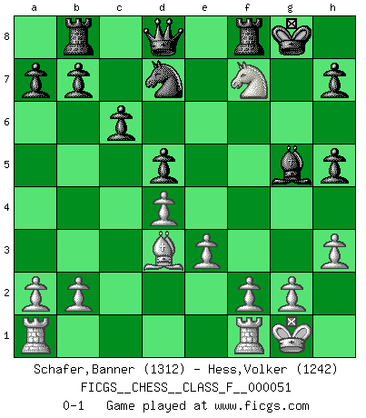 Last move : 0-1 2008 January 26 2:34:50 [Event "FICGS__CHESS__CLASS_F__000051"] [Site "FICGS"] [Date "2007.12.04"] [Round "1"] [White "Schafer,Banner"] [Black "Hess,Volker"] [Result "0-1"] [WhiteElo "1312"] [BlackElo "1242"] 1.d4 d5 2.c4 e6 3.Nf3 Nf6 4.cxd5 exd5 5.Bg5 Be7 6.Nc3 c6 7.e3 O-O 8.Bd3 Bg4 9.O-O Nbd7 10.h3 Bxf3 11.Qxf3 Ne4 12.Nxe4 Bxg5 13.Nd6 Rb8 14.Qh5 g6 15.Nxf7 gxh5 0-1 Queen's gambit declined Kingside Castling by player Black (move 7) Kingside Castling by player White (move 9) Player Black won this chess game. Follow this game move after move (download)Robert Fischer is a law unto himself. (Larry Evans) Schachspieler können ausgezeichnet Varianten am Schachbrett berechnen, aber nicht im realen Leben. Zu stark ist der Individualismus im Schach ausgeprägt, und für viele ist ein kleiner momentaner persönlicher Vorteil wichtiger als ein weit größerer Vorteil von morgen. (Anatoly Karpov) Los Peones son nacidos libres, y aún así, se encuentran encadenados por todos lados. (Rick Kennedy) Shah mat. Le roi est mort. Cri de fierté d'un joueur venant de terrasser son adversaire, courtoisement, sans effusion de sang. Nowadays, anyone who cannot speak English and is incapable of using the Internet is regarded as backward. (Al-Waleed bin Talal)