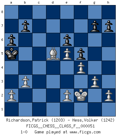 Last move : 1-0 2007 December 13 15:2:32 [Event "FICGS__CHESS__CLASS_F__000051"] [Site "FICGS"] [Date "2007.12.04"] [Round "1"] [White "Richardson,Patrick"] [Black "Hess,Volker"] [Result "1-0"] [WhiteElo "1203"] [BlackElo "1242"] 1.d4 f5 2.g3 Nf6 3.c4 e6 4.Nf3 Be7 5.Bg2 O-O 6.O-O c6 7.Nc3 d5 8.Qc2 Nbd7 9.cxd5 cxd5 10.Nb5 Ne4 11.Nc7 Nb6 12.Nxa8 Nxa8 13.Bf4 Nb6 14.Ne5 Bd6 15.Rac1 Bxe5 16.dxe5 Qe7 17.f3 Ng5 18.Qc7 Qxc7 19.Rxc7 Nf7 20.Rfc1 Nd8 21.Rxc8 Nxc8 22.Rxc8 Nc6 23.Rxf8+ Kxf8 24.Be3 Ke8 25.f4 Kd7 26.Kf2 a6 27.Bc5 Na5 28.b3 Kc6 29.Bb4 Kb5 30.Bxa5 Kxa5 31.Bxd5 1-0 Dutch defense Kingside Castling by player Black (move 5) Kingside Castling by player White (move 6) Player White won this chess game. Follow this game move after move (download)The King is a fighting piece. Use it ! (Wilhelm Steinitz) Die größte Kunst beim Schach besteht darin dem Gegner nicht zu zeigen was er tun kann. (Garry Kasparov) Preferería tener un Peón que un dedo. (Reuben Fine) Les pièces de l'échiquier étaient impitoyables. Elles le retenaient, elles l'absorbaient. Il y avait de l'horreur en cela, mais aussi une harmonie unique. Car, qu'y a-t-il dans le monde, à part les échecs ? (V. Nabokov) The good fighters of old first put themselves beyond the possibility of defeat, and then waited for an opportunity of defeating the enemy. (Sun Tzu)