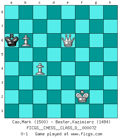 Last move : 0-1 2008 July 9 2:45:26 [Event "FICGS__CHESS__CLASS_D__000072"] [Site "FICGS"] [Date "2007.12.05"] [Round "1"] [White "Cao,Mark"] [Black "Bester,Kazimierz"] [Result "0-1"] [WhiteElo "1500"] [BlackElo "1484"] 1.e4 c5 2.Nf3 a6 3.d4 b6 4.d5 Nf6 5.Nc3 d6 6.Bd3 Nbd7 7.Be3 g6 8.O-O Bg7 9.Qd2 b5 10.a3 O-O 11.Bh6 c4 12.Bxg7 Kxg7 13.Be2 Nc5 14.Rad1 Ncxe4 15.Nxe4 Nxe4 16.Qd4+ Nf6 17.h3 Kg8 18.c3 Bb7 19.Qf4 Nxd5 20.Qh6 e5 21.Rxd5 Bxd5 22.Ng5 Qxg5 23.Qxg5 Rae8 24.Rd1 f6 25.Qg3 Bf7 26.Rxd6 Re6 27.Rxe6 Bxe6 28.Qe3 Kg7 29.Qg3 Bd5 30.Bf3 e4 31.Bg4 Re8 32.Qc7+ Kh6 33.Qd6 f5 34.Bxf5 Bf7 35.Bg4 e3 36.fxe3 Kg7 37.Qxa6 Rxe3 38.Qxb5 h5 39.Bf3 Rd3 40.Qe5+ Kg8 41.Qb8+ Kg7 42.a4 g5 43.a5 g4 44.hxg4 hxg4 45.Bxg4 Re3 46.a6 Re8 47.a7 Re1+ 48.Kf2 Re8 49.Qxe8 Bxe8 50.a8Q Bf7 51.Qb7 Kf6 52.Be2 Be6 53.Qf3+ Ke7 54.Bxc4 Bxc4 55.Qe4+ Be6 56.g4 Kd6 57.g5 Bd5 58.Qd4 Ke6 59.g6 Ba2 60.g7 Kf7 61.b4 Kg6 62.Qg4+ Kf6 63.g8Q Bxg8 64.Qxg8 Ke5 65.b5 Kd6 66.b6 Kc6 67.Qe6+ Kb7 68.c4 Ka6 0-1 This chess game has been lost on time (started : 2007.12.05 11:34:59) Sicilian : O'Kelly variation Kingside Castling by player White (move 8) Kingside Castling by player Black (move 10) 10 pieces endgame at move 49 : White KQBPPPP , Black KBP WHITE : King + 1 Queen 1 Bishop 4 Pawns BLACK : King + 1 Bishop 1 Pawn 9 pieces endgame at move 49 : White KBPPPP , Black KBP WHITE : King + 1 Bishop 4 Pawns BLACK : King + 1 Bishop 1 Pawn Promotion Queen by player White (move 50) 8 pieces endgame at move 54 : White KQBPPP , Black KB WHITE : King + 1 Queen 1 Bishop 3 Pawns BLACK : King + 1 Bishop 7 pieces endgame at move 54 : White KQPPP , Black KB WHITE : King + 1 Queen 3 Pawns BLACK : King + 1 Bishop Promotion Queen by player White (move 63) 6 pieces endgame at move 63 : White KQPP , Black KB WHITE : King + 1 Queen 2 Pawns BLACK : King + 1 Bishop 5 pieces endgame at move 64 : White KQPP , Black K WHITE : King + 1 Queen 2 Pawns BLACK : King + Player Black won this chess game. Follow this game move after move (download)Every Chess master was once a beginner. (Chernev) Kostenjuk hat keinen Sexappeal. (Loek van Wely) El Ajedrez es el gimnasio de la mente. (Blaise Pascal) La conception d'un plan est le processus par lequel un joueur exploite les avantages de sa position tout en s'efforçant d'en réduire au minimum les inconvénients. Afin de garantir le succès, un plan doit toujours se fonder sur un diagnostic objectif des particularités d'une position. La conception d'un plan est d'autant plus difficile que la position est équilibrée, et grandement facilitée lorsqu'il n'existe qu'un seul plan susceptible de répondre aux exigences de la position. (Harry Golombek) Creativity involves breaking out of established patterns in order to look at things in a different way. (Edward De Bono)