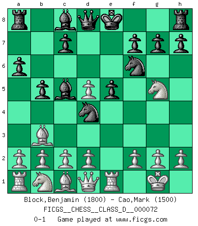 Last move : 0-1 2008 January 4 12:30:22 [Event "FICGS__CHESS__CLASS_D__000072"] [Site "FICGS"] [Date "2007.12.05"] [Round "1"] [White "Block,Benjamin"] [Black "Cao,Mark"] [Result "0-1"] [WhiteElo "1800"] [BlackElo "1500"] 1.e4 e5 2.Nf3 Nc6 3.Bb5 a6 4.Ba4 b5 5.Bb3 Nf6 6.O-O d6 7.Ng5 d5 8.exd5 Nd4 9.Re1 Bc5 0-1 Ruy Lopez : Caro variation Kingside Castling by player White (move 6) Player Black won this chess game. Follow this game move after move (download)In blitz, the Knight is stronger than the Bishop. (Vlastimil Hort) Ich spiele ehrlich und spiele, um zu gewinnen. Wenn ich verliere nehme ich meine Medizin. (Robert James Fischer) El juego de Fischer siempre fue nítido, racional y brillante. Uno de los mejores por siempre. (Dave Regis) Le moment que je préfère le plus dans une rencontre, c'est celui où je sens que la personnalité de l'adversaire se brise. (Robert Fischer) The only difference between a tax man and a taxidermist is that the taxidermist leaves the skin. (Mark Twain)
