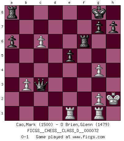 Last move : 0-1 2008 January 15 3:7:27 [Event "FICGS__CHESS__CLASS_D__000072"] [Site "FICGS"] [Date "2007.12.05"] [Round "1"] [White "Cao,Mark"] [Black "O Brien,Glenn"] [Result "0-1"] [WhiteElo "1500"] [BlackElo "1479"] 1.e4 e5 2.Nf3 Nc6 3.Bb5 a6 4.Ba4 Nf6 5.O-O Be7 6.d3 d6 7.Nc3 O-O 8.h3 b5 9.Bb3 Na5 10.Be3 Nxb3 11.axb3 Bb7 12.Qd2 c6 13.Rfd1 Bc8 14.Bg5 b4 15.Qe2 bxc3 16.bxc3 Nh5 17.Bxe7 Qxe7 18.Nh2 Nf4 19.Qf3 Qg5 20.Kh1 f5 21.Rg1 fxe4 22.dxe4 d5 23.Rae1 Qg6 24.exd5 Qxc2 25.dxc6 Nd3 26.Qe3 Nxf2+ 27.Qxf2 Rxf2 28.Ng4 Bxg4 29.hxg4 Qxc3 30.Kh2 Rf6 0-1 Ruy Lopez : Closed defense Kingside Castling by player White (move 5) Kingside Castling by player Black (move 7) Player Black won this chess game. Follow this game move after move (download)Chess is the art of analysis. (Mikhail Botvinnik) Frage des Reporters: -Welche besonderen Umstände rechtfertigen das Anhalten der Uhren während einer Turnierpartie? Antwort: -Einen Fotographen zu strangulieren. (Siegbert Tarrasch) Un Peón pasado aumenta su poder a medida de que el número de piezas en el tablero disminuye. (Capablanca) Toutes les manuvres exécutées sur une colonne ouverte ont pour but ultime l'intrusion définitive sur la septième ou la huitième rangée, en plein cur de la position ennemie. (Aaron Nimzovitch) If you ain't just a little scared when you enter a casino, you are either very rich or you haven't studied the games enough. (Pappy)
