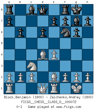 Last move : 0-1 2008 January 2 18:22:45 [Event "FICGS__CHESS__CLASS_D__000072"] [Site "FICGS"] [Date "2007.12.05"] [Round "1"] [White "Block,Benjamin"] [Black "Zaichenko,Andrey"] [Result "0-1"] [WhiteElo "1800"] [BlackElo "1800"] 1.e4 c5 2.Nf3 d6 3.d4 cxd4 4.Nxd4 Nf6 5.Nc3 g6 6.Be3 Bg7 7.Be2 O-O 8.O-O Nc6 9.Re1 Nxd4 10.Bxd4 b6 0-1 Sicilian : Dragon, Classical attack Kingside Castling by player Black (move 7) Kingside Castling by player White (move 8) Player Black won this chess game. Follow this game move after move (download)Pawns are born free, yet they are everywhere in chains. (Rick Kennedy) Gott hat gewollt, dass ich Champion werde. (Surab Azmajparaschvili) Alekhine es un poeta que crea un trabajo de arte de algo que raramente inspiraría a otra persona a mandar una tarjeta postal. (Max Euwe) Nous sommes les pions de la mystérieuse partie d'Echecs jouée par Dieu. Il nous déplace, nous arrête, nous pousse encore, puis nous lance un à un dans la boîte du Néant. Epitaphe sur la tombe de David Janowsky (1868-1927). They misunderestimated me. (George W. Bush, Bentonville nov. 6, 2000)