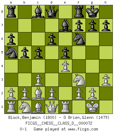 Last move : 0-1 2008 January 2 18:20:40 [Event "FICGS__CHESS__CLASS_D__000072"] [Site "FICGS"] [Date "2007.12.05"] [Round "1"] [White "Block,Benjamin"] [Black "O Brien,Glenn"] [Result "0-1"] [WhiteElo "1800"] [BlackElo "1479"] 1.e4 e5 2.Nf3 Nc6 3.Bb5 a6 4.Ba4 Nf6 5.O-O Be7 6.Re1 b5 7.Bb3 O-O 8.c3 d6 9.h3 Na5 10.Bc2 c5 0-1 Ruy Lopez : Closed, 7...O-O Kingside Castling by player White (move 5) Kingside Castling by player Black (move 7) Player Black won this chess game. Follow this game move after move (download)Of all my Russian books, the defense contains and diffuses the greatest 'warmth' which may seem odd seeing how supremely abstract Chess is supposed to be. (Vladimir Nabokov) Nur ein wirklich starker Spieler weiß wie schwach er spielt. (Savielly Grigorievitsch Tartakower) No puedes jugar al Ajedrez si eres de corazón noble. (Proverbio Francés) Je ne suis pas le dernier à jouer lâchement des coups douteux pendant le zeïtnot de l'adversaire pour l'achever: en effet les coups qui font le plus peur sont ceux que l'on ne comprend pas. Je me fais souvent peur quand je joue. (Un professeur anonyme) Live, lose, and learn, by observing your opponent how to win. (Amber Steenbock)