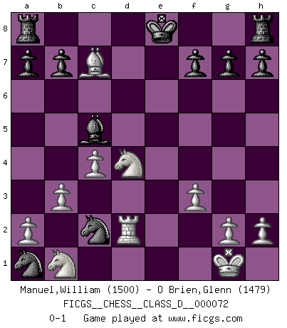 Last move : 0-1 2008 January 23 9:29:52 [Event "FICGS__CHESS__CLASS_D__000072"] [Site "FICGS"] [Date "2007.12.05"] [Round "1"] [White "Manuel,William"] [Black "O Brien,Glenn"] [Result "0-1"] [WhiteElo "1500"] [BlackElo "1479"] 1.b3 e5 2.Bb2 Nc6 3.e3 Nf6 4.Bb5 d6 5.c4 Bd7 6.Ne2 Nb4 7.Bxd7+ Qxd7 8.d3 d5 9.O-O dxc4 10.dxc4 Qxd1 11.Rxd1 Nc2 12.Bxe5 Ng4 13.Bxc7 Nxa1 14.f3 Nxe3 15.Rd2 Bc5 16.Nd4 Nec2 0-1 Nimzovich-Larsen attack : Modern variation Kingside Castling by player White (move 9) Player Black won this chess game. Follow this game move after move (download)The essence of Chess is thinking about what Chess is. (David Bronstein) Ich habe Kasparov in Rente geschickt. (Veselin Topalov) El Ajedrez por encima de todo... ¡es una pelea!. (Emanuel Lasker) Roi des jeux et jeu des rois, les échecs portent en eux un sentiment d'infini. Ils donnent à celui qui s'est efforcé d'en approfondir les arcanes l'impression de n'être pas à la mesure de l'homme; en fait, ils constituent un résumé de l'univers, un microcosme, et figurent cette grande échelle qui, dans les plans de la lumière descend jusqu'à la matière, qui des abîmes insondables remonte jusqu'en l'infini de Dieu. (Pyrame) If you work for a living, why do you kill yourself working ? (Tuco to a chicken in The Good, The Bad and The Ugly)
