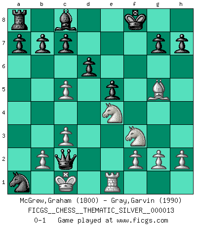 Last move : 0-1 2007 December 5 17:59:58 [Event "FICGS__CHESS__THEMATIC_SILVER__000013"] [Site "FICGS"] [Date "2007.12.05"] [Round "1"] [White "McGrew,Graham"] [Black "Gray,Garvin"] [Result "0-1"] [WhiteElo "1800"] [BlackElo "1990"] 1.e4 e5 2.Nf3 Nc6 3.Bc4 Nf6 4.Ng5 Bc5 5.Bxf7+ Ke7 6.Bd5 Rf8 7.Qf3 Nxd5 8.exd5 Rxf3 9.Nxf3 Nb4 10.c3 Nc2+ 11.Kd1 Nxa1 12.Re1 d6 13.d4 Qg8 14.Bg5+ Kf8 15.dxc5 Qxd5+ 16.Nbd2 Qxa2 17.Ne4 Qa4+ 18.Kc1 Qc2+ 0-1 Comment by player 1 : Graham McGrew : An example of how not to play this as White. Two knights defense : Wilkes Barre (Traxler) variation Player Black won this chess game. Follow this game move after move (download)He who fears an isolated Queen's Pawn should give up Chess. (Siegbert Tarrasch) Das Zentrum ist der Balkan des Schachbretts - Kriegshandlungen können in jedem Moment ausbrechen. (Aaron Nimzowitsch) No hay precio que sea tan grande por la cabellera del Rey enemigo. (Koblentz) Il s'avisa de me proposer d'apprendre les échecs qu'il jouait un peu... me voilà forcené des échecs. J'achète un échiquier, je m'enferme dans ma chambre, j'y passe des jours et des nuits à vouloir apprendre par cur toutes les parties. (Jean-Jacques Rousseau, Confessions) Knowledge will give you power, but character respect. (Bruce Lee)