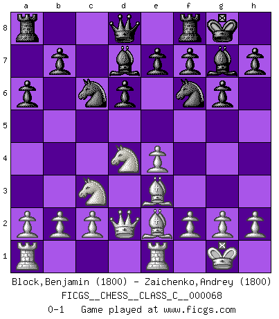 Last move : 0-1 2008 January 2 18:23:18 [Event "FICGS__CHESS__CLASS_C__000068"] [Site "FICGS"] [Date "2007.12.07"] [Round "1"] [White "Block,Benjamin"] [Black "Zaichenko,Andrey"] [Result "0-1"] [WhiteElo "1800"] [BlackElo "1800"] 1.e4 c5 2.Nf3 d6 3.d4 cxd4 4.Nxd4 Nf6 5.Nc3 g6 6.Be3 Bg7 7.Be2 O-O 8.O-O Nc6 9.Qd2 Bd7 10.Rfe1 a6 0-1 Sicilian : Dragon, Classical attack Kingside Castling by player Black (move 7) Kingside Castling by player White (move 8) Player Black won this chess game. Follow this game move after move (download)There is no remorse like the remorse of Chess. (H. G. Wells) Der Verteidiger gebe der Gewalt nach, aber nur der Gewalt. Er schaffe sich nicht freiwillig, etwa aus Blindheit oder aus Schrecken, irgendwelche Schwächen. Er lasse sich nicht bluffen. (Emanuel Lasker) El ganar no lo es todo... pero el perder es nada. (Mednis) Les échecs sont un jeu par leur forme, un art par leur essence et une science par sa difficulté d'acquisition. Ils peuvent vous procurer autant de plaisir qu'un bon livre ou une belle musique, mais vous n'aurez une réelle joie que si vous arrivez à bien jouer. (Tigran Petrosian) Tomorrow's what you make of it. (Horatio Caine, C.S.I. Miami)