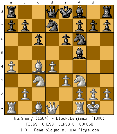 Last move : 1-0 2008 January 2 18:21:21 [Event "FICGS__CHESS__CLASS_C__000068"] [Site "FICGS"] [Date "2007.12.07"] [Round "1"] [White "Wu,Sheng"] [Black "Block,Benjamin"] [Result "1-0"] [WhiteElo "1684"] [BlackElo "1800"] 1.d4 d5 2.c4 c6 3.Nf3 Nf6 4.Nc3 dxc4 5.a4 Bf5 6.e3 e6 7.Bxc4 Nbd7 8.O-O 1-0 QGD Slav : Dutch variation Kingside Castling by player White (move 8) Player White won this chess game. Follow this game move after move (download)He who takes the Queen's Knight's Pawn will sleep in the streets. (Anonymous) Schach ist ein Kampf gegen den Fehler. (Johannes Herrman Zukertort) Botvinnik trató de alejar el misterio referente al Ajedrez, siempre relacionandolo a situaciones de la vida diaria. Solía llamar al Ajedrez un problema inexacto típico, similar a aquellos en que la gente tiene siempre que resolver a cada día. (Garry Kasparov) Je ne crois pas en la psychologie, je crois aux bons coups. (Robert Fischer) Man is reluctant to give credit for intelligence to anyone, except his enemies. (Albert Einstein)