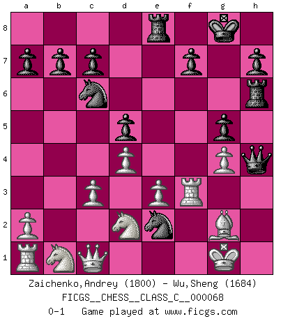 Last move : 0-1 2008 January 5 9:29:4 [Event "FICGS__CHESS__CLASS_C__000068"] [Site "FICGS"] [Date "2007.12.07"] [Round "1"] [White "Zaichenko,Andrey"] [Black "Wu,Sheng"] [Result "0-1"] [WhiteElo "1800"] [BlackElo "1684"] 1.b4 e5 2.Bb2 Bxb4 3.Bxe5 Nf6 4.Nf3 O-O 5.e3 Re8 6.Be2 Nc6 7.Bb2 d5 8.O-O Be6 9.d4 Ne4 10.Nfd2 Qg5 11.Bf3 Bf5 12.c3 Bd6 13.Ba3 Rad8 14.Bxd6 Rxd6 15.g3 Rh6 16.Bg2 Bg4 17.Qc1 Qh5 18.h4 g5 19.f3 Nxg3 20.fxg4 Qxh4 21.Rf3 Ne2+ 0-1 Polish (Sokolsky) opening Kingside Castling by player Black (move 4) Kingside Castling by player White (move 8) Player Black won this chess game. Follow this game move after move (download)The enormous mental resilience, without which no Chess player can exist, was so much taken up by Chess that he could never free his mind of this game. (Albert Einstein) Mein erstes Ziel war nicht, die Partie zu gewinnen, sondern eine Figur zu opfern. -- der junge (Wilhelm Steinitz) Observen a Garry Kasparov. Después de una derrota, invariablemente el gana la próxima partida. Prácticamente hace pedazos a su siguiente oponente. Eso es algo que tenemos que aprender a lograr. (Maurice Ashley) Votre seul travail dans les ouvertures est d'obtenir un milieu de partie jouable. (Lajos Portish) A proverb is a short sentence based on long experience. (Miguel de Cervantes)