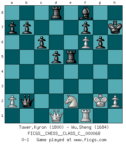 Last move : 0-1 2008 May 22 0:43:1 [Event "FICGS__CHESS__CLASS_C__000068"] [Site "FICGS"] [Date "2007.12.07"] [Round "1"] [White "Tower,Kyron"] [Black "Wu,Sheng"] [Result "0-1"] [WhiteElo "1800"] [BlackElo "1684"] 1.d4 Nf6 2.c4 e6 3.Nf3 d5 4.cxd5 exd5 5.g3 Be7 6.Bg2 O-O 7.O-O c6 8.Nc3 Nbd7 9.Ne5 Nxe5 10.dxe5 Ng4 11.f4 Qb6+ 12.e3 Nxe3 13.Bxe3 Qxe3+ 14.Kh1 Bf5 15.g4 Bd7 16.Rf3 Qb6 17.Na4 Qa5 18.Rh3 Qb5 19.Qc2 h6 20.f5 Rfe8 21.Rf1 Rad8 22.f6 Bf8 23.Nc3 Qc5 24.g5 Bxh3 25.gxh6 Bxg2+ 26.Kxg2 g6 27.h7+ Kxh7 28.Qb3 Qb4 29.Qd1 Qxb2+ 30.Ne2 Rxe5 0-1 Queen's pawn game Kingside Castling by player Black (move 6) Kingside Castling by player White (move 7) Player Black won this chess game. Follow this game move after move (download)Fischer is the strongest player in the world. In fact, the strongest player who ever lived. (Larry Evans) Schach ist Leben. (Robert James Fischer) El arma más poderosa en el Ajedrez, es tener la próxima movida. (David Bronstein) Vouloir jouer aux échecs contre soi-même est aussi paradoxal que vouloir marcher sur son ombre. (Stefan Zweig) Begin at the beginning and go on till you come to the end; then stop. (Lewis Carrol, Alice in Wonderland)