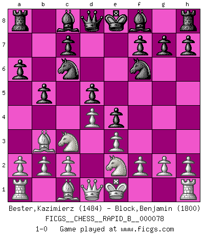 Last move : 1-0 2007 December 28 15:47:34 [Event "FICGS__CHESS__RAPID_B__000078"] [Site "FICGS"] [Date "2007.12.08"] [Round "1"] [White "Bester,Kazimierz"] [Black "Block,Benjamin"] [Result "1-0"] [WhiteElo "1484"] [BlackElo "1800"] 1.d4 d5 2.e3 Nf6 3.Bd3 Nc6 4.Nc3 e5 5.Bb5 e4 6.Nge2 a6 7.Ba4 b5 8.Bb3 1-0 Queen's pawn : Stonewall attack Player White won this chess game. Follow this game move after move (download)The mistakes are there, waiting to be made. (Savielly Tartakower) Es genügt nicht ein guter Spieler zu sein, man muß auch gut spielen. (Siegbert Tarrasch) La mitad de las variaciones que son calculadas en una partida de torneo, resultan ser completamente superfluas. Desafortunadamente, nadie sabe por adelantado cual mitad. (Jan Tinman) La tactique, c'est ce que vous faites quand il y a quelque chose à faire; la stratégie, c'est ce que vous faites quand il n'y a rien à faire. (Savielli Tartacower) It is not enough to be a good player... you must also play well. (Siegbert Tarrasch)