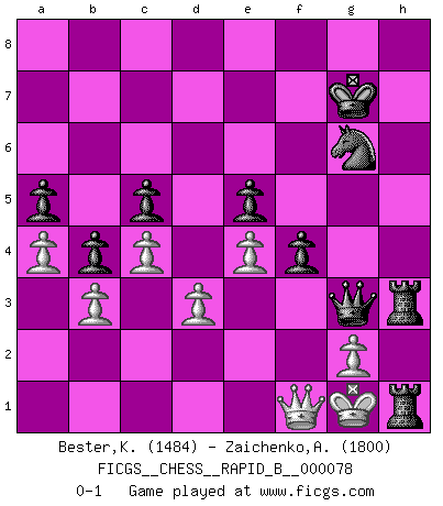 Last move : 0-1 2008 March 5 15:10:49 [Event "FICGS__CHESS__RAPID_B__000078"] [Site "FICGS"] [Date "2007.12.08"] [Round "1"] [White "Bester,Kazimierz"] [Black "Zaichenko,Andrey"] [Result "0-1"] [WhiteElo "1484"] [BlackElo "1800"] 1.e4 c5 2.d3 Nc6 3.c3 e5 4.Nf3 Nf6 5.Bg5 Be7 6.Be2 O-O 7.O-O d5 8.Na3 a6 9.Qc2 b5 10.h3 Bb7 11.Nh4 d4 12.Nf5 Nd7 13.Nxe7+ Nxe7 14.c4 b4 15.Nb1 h6 16.Bh4 g5 17.Bg3 f5 18.Qa4 f4 19.Bh2 Bc6 20.Qd1 a5 21.Bg4 Nf6 22.Nd2 Bd7 23.f3 h5 24.Bxh5 Nxh5 25.a4 Kh7 26.b3 Rh8 27.Ra2 Kg7 28.Kh1 Rh6 29.Rf2 Ng6 30.Nf1 Qe7 31.Rae2 Rah8 32.Kg1 Nf6 33.Nd2 g4 34.fxg4 Nxg4 35.Rf3 Ne3 36.Qb1 Qg5 37.Nf1 Bxh3 38.Nxe3 dxe3 39.Qf1 Bg4 40.R2xe3 Rxh2 41.Rh3 Bxh3 42.Rxh3 R8xh3 43.Kf2 Qg3+ 44.Kg1 Rh1+ 0-1 Sicilian defense Kingside Castling by player Black (move 6) Kingside Castling by player White (move 7) Player Black won this chess game. Follow this game move after move (download)A thorough understanding of the typical mating continuations makes the most complicated sacrificial combinations leading up to them not only not difficult, but almost a matter of course. (Siegbert Tarrasch) Moralische Siege zählen nicht. (Savielly Grigorievitsch Tartakower) El hombre es un frívolo, una creatura engañosa y como un jugador de Ajedrez, se preocupa mas por el proceso de obtener su meta que de la meta por sí misma. (Dostoyevsky) Les sacrifices démontrent seulement que quelqu'un a gaffé. (Savielly Tartacover) Perception is reality. (Immanuel Kant)