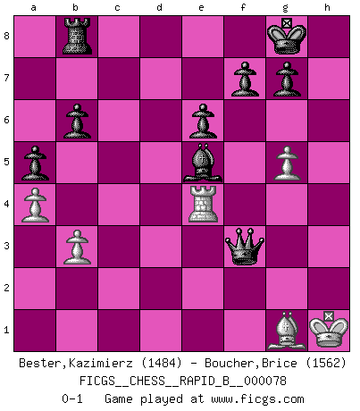 Last move : 0-1 2008 April 6 7:3:51 [Event "FICGS__CHESS__RAPID_B__000078"] [Site "FICGS"] [Date "2007.12.08"] [Round "1"] [White "Bester,Kazimierz"] [Black "Boucher,Brice"] [Result "0-1"] [WhiteElo "1484"] [BlackElo "1562"] 1.e4 c5 2.d3 e6 3.Nf3 d5 4.Nbd2 Nc6 5.Be2 d4 6.a4 Bd6 7.Nc4 Bc7 8.O-O Nge7 9.Bg5 O-O 10.e5 b6 11.Qd2 Qd7 12.c3 Ng6 13.h4 Ngxe5 14.Ncxe5 Nxe5 15.cxd4 cxd4 16.Nxe5 Bxe5 17.f4 Bd6 18.Bf3 Rb8 19.h5 h6 20.Bh4 a5 21.Bg3 Bb7 22.Bxb7 Qxb7 23.Rf3 Qd5 24.Bh2 Qxh5 25.Raf1 Qf5 26.Qe2 Rfc8 27.Rh3 Qc5 28.Rh5 Qc2 29.Qg4 Qxd3 30.Rxh6 Qe3+ 31.Kh1 Rc1 32.Rxc1 Qxc1+ 33.Bg1 Qxf4 34.Qxf4 Bxf4 35.Rh4 Be5 36.b3 d3 37.g4 d2 38.g5 d1Q 39.Re4 Qf3+ 0-1 This chess game has been lost on time (started : 2007.12.08 18:41:34) Sicilian defense Kingside Castling by player White (move 8) Kingside Castling by player Black (move 9) Promotion Queen by player Black (move 38) Player Black won this chess game. Follow this game move after move (download)In order to improve your game, you must study the endgame before everything else, for whereas the endings can be studied and mastered by themselves, the middle game and the opening must be studied in relation to the endgame. (Jose Raul Capablanca) Wenn es im Universum noch irgendwo intelligente Lebewesen gibt, dann kennen sie Go. (Emanuel Lasker) Jugadores de primera clase pierden en contra de jugadores de segunda clase porque los jugadores de segunda clase a veces juegan una partida de primer clase. (Siegbert Tarrasch) Il n'y a plus de joueurs du niveau de Jacob Murray dont la seule quête est le beau jeu, le plaisir de voir les pièces construire quelque chose. Sur 10 idées à la minute, 9 seront sans intérêt, la dernière s'avèrera géniale. (Christian Bauer) Fortune favours the audacious. (Desiderius Erasmus)