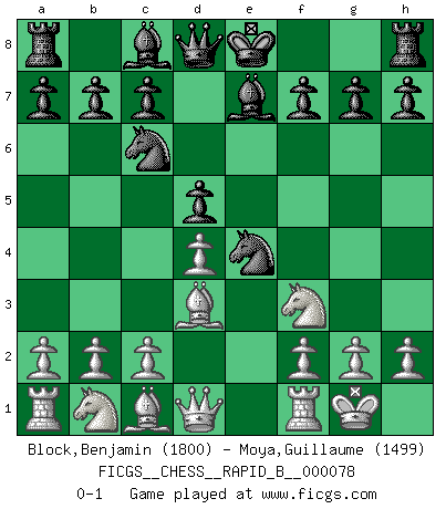 Last move : 0-1 2007 December 28 15:47:55 [Event "FICGS__CHESS__RAPID_B__000078"] [Site "FICGS"] [Date "2007.12.08"] [Round "1"] [White "Block,Benjamin"] [Black "Moya,Guillaume"] [Result "0-1"] [WhiteElo "1800"] [BlackElo "1499"] 1.e4 e5 2.Nf3 Nf6 3.Nxe5 d6 4.Nf3 Nxe4 5.d4 d5 6.Bd3 Nc6 7.O-O Be7 0-1 Petrov : Classical attack Kingside Castling by player White (move 7) Player Black won this chess game. Follow this game move after move (download)If you aren't afraid of Spassky, then I have removed the element of money. (Jim Slater) Gewöhnliche Menschen denken nur daran, wie sie ihre Zeit verbringen. Ein intelligenter Mensch versucht, sie auszunutzen. (Arthur Schopenhauer) Siempre es mejor sacrificar los hombres de tu oponente. (Savielly Tartakower) Je menace de comprendre la position. (Anonyme) The quality of decision is like the well-timed swoop of a falcon which enables it to strike and destroy its victim. (Sun Tzu)