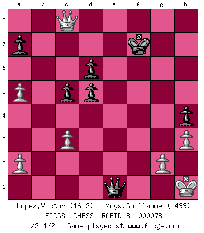 Last move : 1/2-1/2 2008 March 15 0:4:1 [Event "FICGS__CHESS__RAPID_B__000078"] [Site "FICGS"] [Date "2007.12.08"] [Round "1"] [White "Lopez,Victor"] [Black "Moya,Guillaume"] [Result "1/2-1/2"] [WhiteElo "1612"] [BlackElo "1499"] 1.e4 e5 2.Bc4 Nf6 3.d4 exd4 4.Nf3 Nc6 5.e5 d5 6.Bb5 Ne4 7.Nxd4 Bd7 8.Bxc6 bxc6 9.O-O Be7 10.f3 Nc5 11.Nc3 O-O 12.Be3 f6 13.exf6 Rxf6 14.Qd2 Ne6 15.Rae1 Bd6 16.Nxe6 Rxe6 17.Bf4 Rb8 18.Na4 Qf6 19.Bxd6 cxd6 20.Rxe6 Bxe6 21.b3 h5 22.Re1 Bd7 23.c3 h4 24.h3 Rf8 25.Kh2 Qg6 26.Qf2 Qg5 27.Nb2 c5 28.Kh1 Re8 29.Rxe8+ Bxe8 30.f4 Qf5 31.Na4 g5 32.Qe2 Kf7 33.fxg5 Bxa4 34.bxa4 Qxg5 35.a5 Qc1+ 36.Kh2 Qf4+ 37.Kh1 Qe4 38.Qa6 Qe1+ 39.Kh2 Qe5+ 40.Kh1 Qe7 41.Qc8 Qe1+ 1/2-1/2 Bishop's Opening : Urusov gambit Kingside Castling by player White (move 9) Kingside Castling by player Black (move 11) This chess game ended in a draw. Follow this game move after move (download)Blessed be the memory of him who gave the world this immortal game. (A. G. Gardiner) Ich verstehe den Grund nicht, warum die Aufteilung in Frauen und Männer überhaupt im Schach besteht. (Judith Polgar) Los tropiezos estan todos ahí en el tablero, esperando que se cometan. (Savielly Tartakover) Nous vivons dans un monde échiquéen : chaque jour qui passe est un défi à relever. (Philosophe Sasha) Art is the triumph over chaos. (John Cheever)