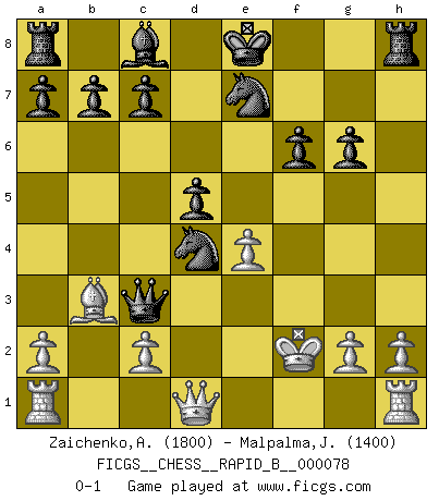 Last move : 0-1 2007 December 13 12:56:41 [Event "FICGS__CHESS__RAPID_B__000078"] [Site "FICGS"] [Date "2007.12.08"] [Round "1"] [White "Zaichenko,Andrey"] [Black "Malpalma,Joaquim"] [Result "0-1"] [WhiteElo "1800"] [BlackElo "1400"] 1.b4 e5 2.Bb2 f6 3.e4 Bxb4 4.Bc4 Nc6 5.f4 Qe7 6.f5 g6 7.Nc3 Bxc3 8.Bxc3 Qc5 9.Bb3 Nge7 10.fxg6 hxg6 11.Ne2 d5 12.d4 exd4 13.Nxd4 Qxc3+ 14.Kf2 Nxd4 0-1 Polish (Sokolsky) opening Player Black won this chess game. Follow this game move after move (download)Different people feel differently about resigning. (Bobby Fischer) Ohne ihre Erfolge schmälern zu wollen würde ich sagen Petrosian, Spassky und Karpov verdanken ihre Siege ihren Trainern - Boleslavsky, Bondarevsky und Furman. (Mikhail Moiseyevich Botvinik) Solo el jugador con la iniciativa tiene el derecho a atacar. (Wilhelm Steinitz) Des idées, des idées, j'en ai cent, j'en ai mille. Des bonnes, des mauvaises, applicables, irréalisables... Il suffit de faire le tri ! (Roos) The right perception of any matter and a misunderstanding of the same matter do not wholly exclude each other. (Kafka's the trial)