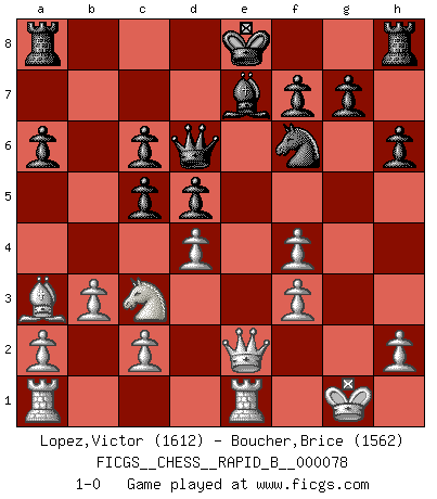 Last move : 1-0 2008 January 19 10:20:22 [Event "FICGS__CHESS__RAPID_B__000078"] [Site "FICGS"] [Date "2007.12.08"] [Round "1"] [White "Lopez,Victor"] [Black "Boucher,Brice"] [Result "1-0"] [WhiteElo "1612"] [BlackElo "1562"] 1.e4 c5 2.Nc3 e6 3.f4 d5 4.Bb5+ Nc6 5.exd5 exd5 6.Nf3 a6 7.Bxc6+ bxc6 8.Qe2+ Be7 9.O-O Nf6 10.Re1 Bg4 11.b3 h6 12.Ba3 Bxf3 13.gxf3 Qd6 14.d4 1-0 Sicilian : Closed Kingside Castling by player White (move 9) Player White won this chess game. Follow this game move after move (download)Chess is a cold bath for the mind. (Sir John Simon) Der vorletzte Fehler gewinnt. (Savielly Grigorievitsch Tartakower) Debemos de asegurarnos de que el Ajedrez no se convierta en un lenguaje muerto, muy interesante, pero solo para un grupo muy pequeño. (Sytze Faber) Les échecs c'est le défi de l'alpiniste, toujours plus haut, prêt à tout pour monter à l'assaut du Roi ennemi. Les échecs, c'est de la musique en mouvement, un ballet majestueux pour les yeux. C'est de la poésie composée par les fantômes du passé qui au même titre que Rimbaud ou Verlaine méritent notre admiration. Les échecs, c'est de la peinture ou le moindre mouvement modifie le tableau pour en faire un Picasso ou un Van Gogh. Les échecs, c'est tout et rien, c'est la vie et la mort. Jjulie33 sur le forum de France-Echecs. I don't diet. I just don't eat as much as I'd like to. (Linda Evangelista, supermodel)