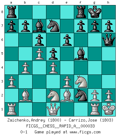 Last move : 0-1 2008 January 22 19:13:33 [Event "FICGS__CHESS__RAPID_A__000033"] [Site "FICGS"] [Date "2007.12.09"] [Round "1"] [White "Zaichenko,Andrey"] [Black "Carrizo,Jose"] [Result "0-1"] [WhiteElo "1800"] [BlackElo "1803"] 1.b4 d5 2.Bb2 Nf6 3.Nf3 Bf5 4.e3 e6 5.a3 Nbd7 6.c4 c6 7.d4 Bd6 8.c5 Bc7 9.Be2 O-O 10.O-O Ne4 11.Nbd2 Qf6 12.Kh1 Qh6 13.Rg1 Nxf2+ 0-1 Polish (Sokolsky) opening Kingside Castling by player Black (move 9) Kingside Castling by player White (move 10) Player Black won this chess game. Follow this game move after move (download)When you absolutely don't know what to do anymore, it is time to panic. (John van der Wiel) Es gibt zwei Arten von Opfern: Korrekte und meine. (Mikhail Nekhemyevich Tal) Todos los jugadores de Ajedrez deberían tener un pasatiempo. (Savielly Tartakower) Mais l'homme est une créature légère et illogique : semblable au joueur d'échecs, il n'aime que le processus du but à atteindre, non le but lui-même. (Dostoïevsky) No man has ever achieved immortality in his own life time. (Unknown)