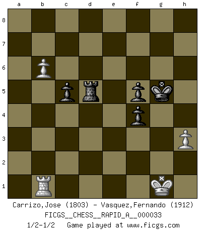 Last move : 1/2-1/2 2008 April 26 22:57:40 [Event "FICGS__CHESS__RAPID_A__000033"] [Site "FICGS"] [Date "2007.12.09"] [Round "1"] [White "Carrizo,Jose"] [Black "Vasquez,Fernando"] [Result "1/2-1/2"] [WhiteElo "1803"] [BlackElo "1912"] 1.e4 e5 2.Nf3 d6 3.d4 exd4 4.Nxd4 Nf6 5.Nc3 Be7 6.g3 O-O 7.Bg2 Bg4 8.f3 c5 9.Nde2 Bd7 10.O-O Nc6 11.Nf4 Re8 12.b3 h5 13.Be3 Qa5 14.Ncd5 Nxd5 15.Nxd5 Bd8 16.Qe1 Qxe1 17.Rfxe1 Rc8 18.Rad1 h4 19.c4 h3 20.Bf1 Ne5 21.Kf2 Rc6 22.Bc1 Ra6 23.a3 Ba5 24.Re3 Bd8 25.Bb2 Kf8 26.Re2 Nc6 27.Red2 Be6 28.Nf4 Bf6 29.Bxf6 gxf6 30.a4 Rb6 31.Rb1 Nd4 32.b4 Ra6 33.Ra2 b6 34.g4 Kg7 35.Nd5 Rc8 36.Rd1 Bd7 37.R1d2 Rxa4 38.b5 Rxa2 39.Rxa2 Be6 40.Rxa7 Bxd5 41.exd5 f5 42.Ra6 f4 43.Rxb6 Re8 44.Rxd6 Re3 45.Ra6 Rxf3+ 46.Kg1 Rb3 47.Ra2 Kf6 48.Rf2 Nf3+ 49.Kh1 Kg5 50.d6 Ne5 51.Re2 Nxg4 52.Kg1 Rb1 53.d7 Rd1 54.Re1 Rxd7 55.Bxh3 f5 56.Bg2 Rd3 57.h3 Ne3 58.Rb1 Rd2 59.Bd5 Nxd5 60.cxd5 Rxd5 61.b6 1/2-1/2 Philidor : Exchange variation Kingside Castling by player Black (move 6) Kingside Castling by player White (move 10) 10 pieces endgame at move 60 : White KRPPP , Black KRPPP WHITE : King + 1 Rook 3 Pawns BLACK : King + 1 Rook 3 Pawns 9 pieces endgame at move 60 : White KRPP , Black KRPPP WHITE : King + 1 Rook 2 Pawns BLACK : King + 1 Rook 3 Pawns This chess game ended in a draw. Follow this game move after move (download)You are for me the Queen on d8 and I am the Pawn on d7 !! (Eduard Gufeld) Kombinieren und Schwarzhandel gehören verboten. (Savielly Grigorievitsch Tartakower) La estratégia requiere pensar, la táctica requiere observación. (Max Euwe) Si rien de grave n'est détecté lors de l'analyse d'une position, on joue alors le coup. Seconde règle de Blumenfeld. Is not life a hundred times too short to bore ourselves ? (Friedrich Nietzsche)