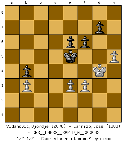 Last move : 1/2-1/2 2008 April 14 3:11:3 [Event "FICGS__CHESS__RAPID_A__000033"] [Site "FICGS"] [Date "2007.12.09"] [Round "1"] [White "Vidanovic,Djordje"] [Black "Carrizo,Jose"] [Result "1/2-1/2"] [WhiteElo "2078"] [BlackElo "1803"] 1.d4 d5 2.c4 e6 3.Nf3 c6 4.e3 Nf6 5.Nc3 Nbd7 6.Bd3 dxc4 7.Bxc4 b5 8.Bd3 Bb7 9.a3 Bd6 10.O-O O-O 11.Qc2 a5 12.Bd2 Qb8 13.Rfc1 Rc8 14.Qb3 b4 15.Ne4 Nxe4 16.Bxe4 Nf6 17.Bd3 c5 18.dxc5 Rxc5 19.Rxc5 Bxc5 20.axb4 axb4 21.Rxa8 Bxa8 22.Qc2 Qd6 23.h3 Bb7 24.b3 h6 25.Bc1 Qd5 26.e4 Qd8 27.e5 Nd7 28.Bh7+ Kf8 29.Be4 Bxe4 30.Qxe4 Qb6 31.Qc2 Qc6 32.Bf4 Qd5 33.h4 Ke8 34.Kf1 Nb8 35.Be3 Bxe3 36.Qc8+ Qd8 37.Qxd8+ Kxd8 38.fxe3 Nd7 39.Ke2 Nc5 40.Nd4 Kc7 41.Kf3 h5 42.Kf4 Kb6 43.Kg5 Nd3 44.Kxh5 Nxe5 45.Nf3 Nxf3 46.gxf3 Kc6 47.Kg4 Kd6 48.Kf4 Kd5 49.h5 f6 50.Kg3 Ke5 51.Kg4 1/2-1/2 Queen's gambit declined Kingside Castling by player White (move 10) Kingside Castling by player Black (move 10) 10 pieces endgame at move 46 : White KPPPP , Black KPPPP WHITE : King + 4 Pawns BLACK : King + 4 Pawns This chess game ended in a draw. Follow this game move after move (download)I'd rather have a Pawn than a finger. (Reuben Fine) Ich verlor meine Bürgerrechte, mein Gehalt wurde mir nicht mehr bezahlt und ich wurde zensiert und durfte nicht mehr ins Ausland reisen. [nach dem Match Fischer-Taimanov 6:0] (Mark Taimanov) El Ajedrez es un juego terrible. Si no dominas el centro, tu oponente tiene una posición mas libre. Si tu tienes el centro, entonces realmente tienes algo de que preocuparte. (Siegbert Tarrasch) La vie est comme un jeu d'échecs : nous esquissons un plan, mais celui-ci est tributaire de ce que daignent faire l'adversaire aux échecs et le destin dans la vie. (Arthur Schopenhauer) In every real man a child is hidden that wants to play. (Friedrich Nietzsche)
