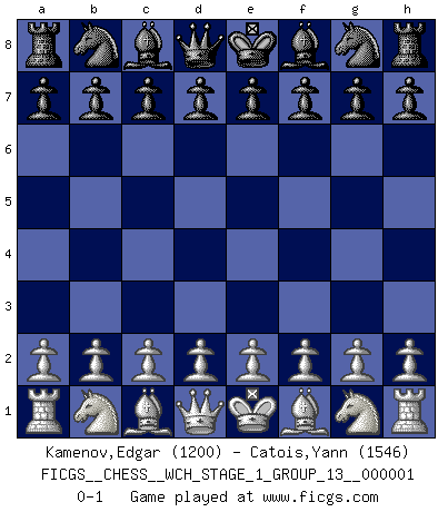 Last move : 0-1 2006 August 31 19:3:29 [Event "FICGS__CHESS__WCH_STAGE_1_GROUP_13__000001"] [Site "FICGS"] [Date "2006.07.01"] [Round "1"] [White "Kamenov,Edgar"] [Black "Catois,Yann"] [Result "0-1"] [WhiteElo "1200"] [BlackElo "1546"] 0-1 This chess game has been lost on time (started : 2006.07.01 16:17:25) Player Black won this chess game. Follow this game move after move (download)Castle early and often. (Rob Sillars) Ivan Sokolov treibt mich als Beifahrer an mit go Loeky go - . (Loek van Wely) Un entendimiento minucioso de las típicas continuaciones de mate hacen de las mas complicadas combinaciones de sacrificio que conducen hacia ellas no solo no dificiles, sino casi un asunto de rutina. (Siegbert Tarrasch) Les Echecs sont et restent toujours un combat, un combat intégral comme la boxe, la lutte ou un autre sport, et où il doit y avoir un vainqueur et un vaincu. (Joseph Emil Diemer) CHESS, n. f. [echecs, Fr.] A nice and abstruse game, in which two sets of puppets are moved in opposition to each other. (Dr Samuel Johnson, A Dictionary Of The English Language, 1755)