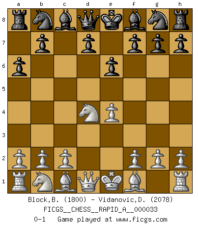 Last move : 0-1 2007 December 27 11:12:0 [Event "FICGS__CHESS__RAPID_A__000033"] [Site "FICGS"] [Date "2007.12.09"] [Round "1"] [White "Block,Benjamin"] [Black "Vidanovic,Djordje"] [Result "0-1"] [WhiteElo "1800"] [BlackElo "2078"] 1.e4 c5 2.Nf3 e6 3.d4 cxd4 4.Nxd4 a6 0-1 Sicilian : Kan variation Player Black won this chess game. Follow this game move after move (download)In complicated positions, Bobby Fischer hardly had to be afraid of anybody. (Paul Keres) Je mehr ich von der FIDE weiss, um so weniger verstehe ich. (Alexander Kalifman) Mi estilo es algo parecido entre un poco de Tal y Petrosian. (Reshevsky) Demandez au pauvre Cg1 ce qu'il en pense. Eduard Gufeld à propos de la variante Saemisch de l'Est-Indienne. I believe in luck. How else can you explain the success of those you dislike ? (Jean Cocteau)