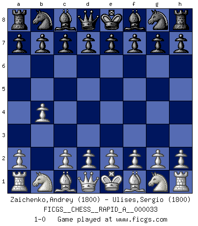 Last move : 1-0 2008 January 8 22:57:46 [Event "FICGS__CHESS__RAPID_A__000033"] [Site "FICGS"] [Date "2007.12.09"] [Round "1"] [White "Zaichenko,Andrey"] [Black "Ulises,Sergio"] [Result "1-0"] [WhiteElo "1800"] [BlackElo "1800"] 1.b4 1-0 This chess game has been lost on time (started : 2007.12.09 17:26:18) Polish (Sokolsky) opening Player White won this chess game. Follow this game move after move (download)The Chess pieces are the block alphabet which shapes thoughts; and these thoughts, although making a visual design on the chessboard, express their beauty abstractly, like a poem. (Marcel Duchamp) Aljechin war kein Nazi. Er war ein Opportunist. Ein schrecklicher Mann. Er liebte Geld über alles und würde für Geld ein Jude, ein Katolik oder ein Protestant werden. (Miguel Najdorf) No hay un Gran Maestro de Ajedrez que sea normal; solo se diferencían ellos por la magnitud de su locura. (Viktor Korchnoi) L'attaque fait le spectacle, la défense gagne les matchs. (Dicton footballistique) It's not enough to succeed. Others must fail. (Gore Vidal)