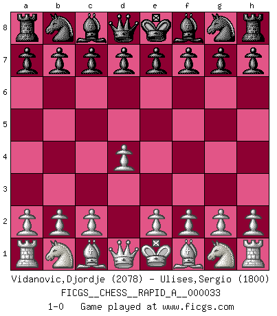 Last move : 1-0 2008 January 8 22:57:46 [Event "FICGS__CHESS__RAPID_A__000033"] [Site "FICGS"] [Date "2007.12.09"] [Round "1"] [White "Vidanovic,Djordje"] [Black "Ulises,Sergio"] [Result "1-0"] [WhiteElo "2078"] [BlackElo "1800"] 1.d4 1-0 This chess game has been lost on time (started : 2007.12.09 17:26:18) Queen's pawn Player White won this chess game. Follow this game move after move (download)During a Chess competition a Chessmaster should be a combination of a beast of prey and a monk. (Alexander Alekhine) Ich habe kein Problem mit Frauen, sondern nur mit dem Niveau ihres Schachspiels (Judith Polgar) Si el ingenio solamente fuese necesario para lucirse, las mujeres serían las mejores jugadoras de Ajedrez del mundo. (Albin) Le profane ne songe pas à la somme de jouissance dont il se prive, qui méconnaît ce jeu aux ressources aussi variées que passionnantes. (Jean-Marie Jeanton-Lamarche) A belief is an idea the mind possesses, an idea that possesses the mind. (Robert Oxden Bolton)