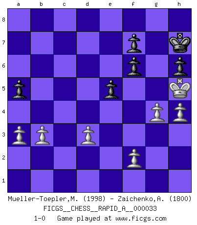 Last move : 1-0 2008 January 1 10:41:21 [Event "FICGS__CHESS__RAPID_A__000033"] [Site "FICGS"] [Date "2007.12.09"] [Round "1"] [White "Mueller-Toepler,Michael"] [Black "Zaichenko,Andrey"] [Result "1-0"] [WhiteElo "1998"] [BlackElo "1800"] 1.d4 Nf6 2.c4 e6 3.Nf3 c5 4.g3 cxd4 5.Nxd4 Bc5 6.Bg2 d5 7.O-O dxc4 8.Qa4+ Bd7 9.Qxc4 Bxd4 10.Qxd4 Nc6 11.Qh4 O-O 12.Rd1 Qb6 13.Nc3 Ne5 14.Bg5 Ng6 15.Qd4 Qxd4 16.Rxd4 Bc6 17.Bxc6 bxc6 18.Bxf6 gxf6 19.Rad1 a5 20.Kg2 c5 21.Rc4 Rfc8 22.Na4 Ne5 23.Rxc5 Rxc5 24.Nxc5 Rc8 25.Rc1 Nd7 26.Nb3 Rxc1 27.Nxc1 Nc5 28.Nd3 Nxd3 29.exd3 Kf8 30.Kf3 Ke7 31.Kg4 Kf8 32.Kh5 Kg7 33.g4 h6 34.b3 e5 35.h4 Kh7 36.a3 1-0 Queen's pawn game Kingside Castling by player White (move 7) Kingside Castling by player Black (move 11) Player White won this chess game. Follow this game move after move (download)The tactician knows what to do when there is something to do; whereas the strategian knows what to do when there is nothing to do. (Gerald Abrahams) Mit sehr nachdenklichem Gesicht schreitet Bobby durch den Turniersaal. Was ist passiert?, fragt Lombardy. Ich stehe schlecht, antwortet Fischer. Lombardy: Dann biete doch einfach Remis an. Fischer: So schlecht stehe ich nun auch wieder nicht! (Robert James Fischer) No volvere nunca a jugar contigo. Has insultado a mi amigo. - cuando un oponente se maldijo por una mala jugada (Miguel Najdorf) Ne tendez aucun piège pour le plaisir ! Ne jouez rien dans l'espoir que l'adversaire réagisse de façon stupide ! Prenez toujours pour acquis que l'adversaire va trouver le meilleur coup ! Ne jouez jamais de coup dans l'espoir que l'adversaire ne voie pas la menace ! Chacun de vos coups doit améliorer la position d'une façon ou d'une autre. Beta. Software undergoes beta testing shortly before it's released. Beta is latin for still doesn't work. (Anonymous)