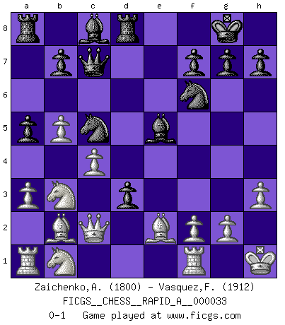 Last move : 0-1 2008 January 6 8:40:48 [Event "FICGS__CHESS__RAPID_A__000033"] [Site "FICGS"] [Date "2007.12.09"] [Round "1"] [White "Zaichenko,Andrey"] [Black "Vasquez,Fernando"] [Result "0-1"] [WhiteElo "1800"] [BlackElo "1912"] 1.b4 d5 2.Bb2 Nf6 3.e3 e6 4.a3 a5 5.b5 Nbd7 6.Nf3 Bd6 7.Be2 O-O 8.O-O d4 9.exd4 c5 10.c4 cxd4 11.Bxd4 e5 12.Bb2 e4 13.Nd4 Qc7 14.h3 Bh2+ 15.Kh1 Be5 16.Qc2 Nc5 17.d3 Rd8 18.Nb3 exd3 0-1 Polish (Sokolsky) opening Kingside Castling by player Black (move 7) Kingside Castling by player White (move 8) Player Black won this chess game. Follow this game move after move (download)Every Pawn is a potential Queen. (James Mason) Der Traum, für den ich lebe, ist der von einem freien Russland. Viele mögen sagen: Russland hat doch ein Parlament, einen gewählten Präsidenten. Aber ich spüre, dass in meiner Heimat die Angst wiederkehrt. Eine Angst, sich frei zu äußern, bestimmte Dinge zu tun (Garry Kasparov) El Ajedrez es como la guerra en un tablero. (Bobby Fischer) 'L'échange des dames est un coup dur pour les deux adversaires...' Un journaliste lors d'une partie du match Spassky-Fischer It's only after you lost everything, Tyler says, that you're free to do anything. (Chuck Palahniuk, Fight Club)