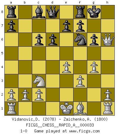 Last move : 1-0 2007 December 26 8:29:27 [Event "FICGS__CHESS__RAPID_A__000033"] [Site "FICGS"] [Date "2007.12.09"] [Round "1"] [White "Vidanovic,Djordje"] [Black "Zaichenko,Andrey"] [Result "1-0"] [WhiteElo "2078"] [BlackElo "1800"] 1.e4 c5 2.Nf3 d6 3.d4 cxd4 4.Nxd4 Nf6 5.Nc3 g6 6.Be3 Bg7 7.f3 O-O 8.g4 h6 9.Qd2 Nc6 10.Nxc6 bxc6 11.Bxh6 Bxh6 12.Qxh6 1-0 Sicilian : Dragon, Yugoslav attack, 7...O-O Kingside Castling by player Black (move 7) Player White won this chess game. Follow this game move after move (download)Chess is like life. (Boris Spassky) Warum muß ich gegen diesen IDIOTEN verlieren? (Aaron Nimzowitsch) El Ajedrez te enseña a controlarl la excitación inicial que sientes cuando vez algo que parece bueno y te enseña a pensar objetivamente cuando te encuentras en problemas. (Stanley Kubrick) J'ai toujours senti une vague pitié pour l'homme qui ne connaît rien aux échecs, tout comme j'en aurais pour un homme ignorant de l'amour. Les Echecs, comme la musique ou comme l'amour, ont le pouvoir de rendre heureux. (Siegbert Tarrasch) Memory is a crazy woman that hoards colored rags and throws away food. (Austin O'Malley)