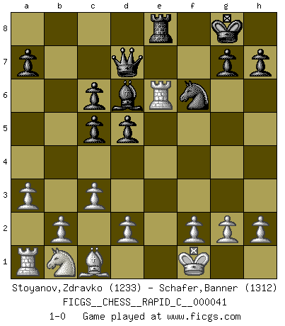 Last move : 1-0 2008 February 6 0:44:6 [Event "FICGS__CHESS__RAPID_C__000041"] [Site "FICGS"] [Date "2007.12.13"] [Round "1"] [White "Stoyanov,Zdravko"] [Black "Schafer,Banner"] [Result "1-0"] [WhiteElo "1233"] [BlackElo "1312"] 1.e4 c5 2.Nf3 Nc6 3.Bb5 e6 4.Bxc6 bxc6 5.a3 d5 6.e5 f6 7.exf6 Nxf6 8.O-O Ba6 9.Re1 Qd7 10.c3 Bd6 11.Ng5 O-O 12.Nxe6 Rfe8 13.Qe2 Bxe2 14.Rxe2 Rxe6 15.Kf1 Rae8 16.Rxe6 1-0 This chess game has been lost on time (started : 2007.12.13 5:9:8) Sicilian : Nimzovich-Rossolimo attack (without ...d6) Kingside Castling by player White (move 8) Kingside Castling by player Black (move 11) Player White won this chess game. Follow this game move after move (download)It is difficult to play against Einstein's theory --on his first loss to Fischer. (Mikhail Tal) Wenn man heute mit 14 Jahren noch kein GM ist, kann man es vergessen. (Viswanathan Anand) Por esta medida (el intervalo entre Fischer y sus contemporaneos), yo le considero el mas grande campeón mundial. (Garry Kasparov) Les sacrifices démontrent seulement que quelqu'un a gaffé. (Savielly Tartacover) Life is like internet, nothing interesting, but noone want to leave it. (Ilmars Cirulis)