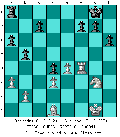 Last move : 1-0 2007 December 31 14:50:35 [Event "FICGS__CHESS__RAPID_C__000041"] [Site "FICGS"] [Date "2007.12.13"] [Round "1"] [White "Barradas,Anderson"] [Black "Stoyanov,Zdravko"] [Result "1-0"] [WhiteElo "1312"] [BlackElo "1233"] 1.e4 e5 2.Nf3 d6 3.d4 Be7 4.dxe5 dxe5 5.Nc3 Nc6 6.Bb5 Bd7 7.O-O a6 8.Ba4 b5 9.Bb3 h6 10.Nd5 Nf6 11.Nxf6+ Bxf6 12.h3 O-O 13.Be3 Qc8 14.Qd3 Rd8 15.a3 Bxh3 16.gxh3 Rxd3 17.cxd3 Qxh3 18.Nh2 Nd4 19.Bxd4 exd4 20.Rad1 Be5 21.f4 Qe3+ 22.Rf2 Bxf4 23.Nf1 Qh3 24.Rxf4 Qh5 25.Ng3 Qxd1+ 26.Bxd1 1-0 Philidor's defense Kingside Castling by player White (move 7) Kingside Castling by player Black (move 12) Player White won this chess game. Follow this game move after move (download)Of Chess it has been said that life is not long enough for it, but that is the fault of life, not Chess. (William Ewart Napier) Wenn du gegen Bobby spielst, ist es keine Frage von gewinnen oder verlieren. Es ist eine Frage des Überlebens. (Boris Vassilievich Spassky) Yo adoro todas la posiciones. Denme una partida posicional difícil, y la jugaré. Pero posiciones totalmente ganadas, no las tolero. (Hein Donner) Vous savez, camarade Pachman, je n'éprouve pas de plaisir à être ministre, je jouerais plutôt aux échecs comme vous, ou alors ferais une révolution au Venezuela. (Che Guevara à Ludek Pachman, 'Checkmate in Prague', 1975) Creativity is allowing yourself to make mistakes. Art is knowing which ones to keep. (Scott Adams)