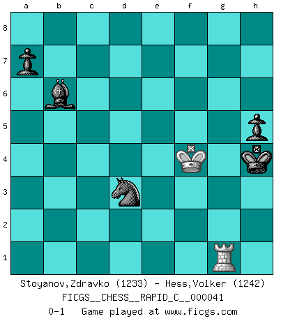 Last move : 0-1 2007 December 29 19:44:0 [Event "FICGS__CHESS__RAPID_C__000041"] [Site "FICGS"] [Date "2007.12.13"] [Round "1"] [White "Stoyanov,Zdravko"] [Black "Hess,Volker"] [Result "0-1"] [WhiteElo "1233"] [BlackElo "1242"] 1.e4 e5 2.Nf3 Nc6 3.a3 Nf6 4.d3 Be7 5.Be2 O-O 6.O-O d5 7.c3 dxe4 8.dxe4 Qxd1 9.Rxd1 Nxe4 10.Bb5 Bg4 11.Rd3 Rad8 12.Re3 Rd1+ 13.Ne1 Bf5 14.f3 Nc5 15.Nd2 Bg5 16.Re2 Rd8 17.b4 Nd3 18.Bxd3 Bxd3 19.Kf2 Bxe2 20.Kxe2 R1xd2+ 21.Bxd2 Rxd2+ 22.Kf1 Rd6 23.c4 Bf6 24.Rb1 Rd2 25.h3 e4 26.fxe4 Ne5 27.c5 Nd3 28.Nf3 Rb2 29.Rd1 Rb3 30.a4 Nxb4 31.e5 Be7 32.Rd7 Bxc5 33.Rxc7 Rb1+ 34.Ne1 Rc1 35.Rxb7 Nd3 36.Ke2 Nxe1 37.Kd2 Kf8 38.Kxc1 Nxg2 39.Rc7 Bb6 40.Rd7 Nf4 41.h4 Ng6 42.e6 fxe6 43.h5 Nf4 44.h6 gxh6 45.Rxh7 Nd5 46.Kb2 Be3 47.Rh8+ Kf7 48.Kc2 Kg6 49.Kd3 Bb6 50.Ke4 Nc3+ 51.Ke5 Nxa4 52.Kxe6 Nc5+ 53.Ke5 Kg5 54.Rg8+ Kh4 55.Kf4 h5 56.Rg1 Nd3+ 0-1 King's pawn game Kingside Castling by player Black (move 5) Kingside Castling by player White (move 6) 10 pieces endgame at move 44 : White KRP , Black KBNPPPP WHITE : King + 1 Rook 1 Pawn BLACK : King + 1 Bishop 1 Knight 4 Pawns 9 pieces endgame at move 45 : White KRP , Black KBNPPP WHITE : King + 1 Rook 1 Pawn BLACK : King + 1 Bishop 1 Knight 3 Pawns 8 pieces endgame at move 51 : White KR , Black KBNPPP WHITE : King + 1 Rook BLACK : King + 1 Bishop 1 Knight 3 Pawns 7 pieces endgame at move 52 : White KR , Black KBNPP WHITE : King + 1 Rook BLACK : King + 1 Bishop 1 Knight 2 Pawns Player Black won this chess game. Follow this game move after move (download)He who takes the Queen's Knight's Pawn will sleep in the streets. (Anonymous) Über Kasparov: Es ist offensichtlich, daß er in einem totalitären Staat aufwuchs und deshalb zu diktatorischen Zügen neigt. (Viktor Kortschnoi) El arma más poderosa en el Ajedrez, es tener la próxima movida. (David Bronstein) Si le désir cupide (et stupide) de gagner est une inépuisable source de souffrance, une combinaison brillante sur l'échiquier est une découverte : le coquelicot qui s'épanouit lorsque apparaît la Voie Lactée. (Arrabal) Always be a first-rate version of yourself, instead of a second-rate version of somebody else. (Judy Garland)