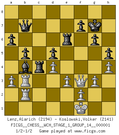 Last move : 1/2-1/2 2006 November 2 14:24:54 [Event "FICGS__CHESS__WCH_STAGE_1_GROUP_14__000001"] [Site "FICGS"] [Date "2006.07.01"] [Round "1"] [White "Lenz,Alarich"] [Black "Koslowski,Volker"] [Result "1/2-1/2"] [WhiteElo "2194"] [BlackElo "2141"] 1.d4 Nf6 2.c4 g6 3.Nc3 d5 4.Nf3 Bg7 5.Bg5 Ne4 6.cxd5 Nxg5 7.Nxg5 e6 8.Nf3 exd5 9.b4 Qd6 10.Qb3 Nc6 11.e3 Bf5 12.b5 Na5 13.Qa4 b6 14.Be2 O-O 15.O-O Rac8 16.Rac1 Bd7 17.Qc2 c6 18.bxc6 Rxc6 19.Qd2 Nc4 20.Bxc4 Rxc4 21.Ne5 R4c8 22.Nxd7 Qxd7 23.Ne2 Rc4 24.Qb2 Rb8 25.Rc3 b5 26.Nf4 Rbc8 27.Rb3 a6 28.Qe2 Rc2 29.Qf3 Rd8 30.Ra1 Qc6 31.Nd3 Bf8 32.g3 Bd6 33.h4 h5 34.Ne1 Rc4 35.Nd3 Re8 36.Rab1 Kg7 37.R1b2 Re4 38.Kf1 Qb7 39.a3 Re6 40.Nb4 Bxb4 1/2-1/2 Comment by player 1 : Alarich Lenz : i agree with a draw. i did not see your offer imidiatly and made my move King's Indian defense, 3.Nc3 Kingside Castling by player Black (move 14) Kingside Castling by player White (move 15) This chess game ended in a draw. Follow this game move after move (download)Good positions don't win games, good moves do. (Gerald Abrahams) Eine Person mit durchschnittlichem IQ kann etwa eine ELO von 2000 erreichen. (Jonathan Levitt) En el Ajedrez, tal como es jugado por los Maestros, practicamente la suerte es eliminada. (Emanuel Lasker) Pour moi, les échecs ne sont pas un jeu mais un art. (Alexandre Alekhine) Difficult things take a long time, impossible things a little longer. (Author unknown)