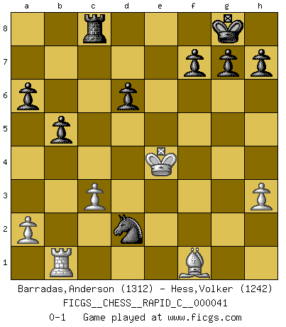 Last move : 0-1 2007 December 31 17:36:32 [Event "FICGS__CHESS__RAPID_C__000041"] [Site "FICGS"] [Date "2007.12.13"] [Round "1"] [White "Barradas,Anderson"] [Black "Hess,Volker"] [Result "0-1"] [WhiteElo "1312"] [BlackElo "1242"] 1.e4 c5 2.Nf3 d6 3.d4 cxd4 4.Nxd4 Nf6 5.Nc3 a6 6.Bd3 e5 7.Bg5 exd4 8.Nd5 Be7 9.O-O Nxd5 10.Bxe7 Nxe7 11.Re1 O-O 12.c3 dxc3 13.bxc3 Nbc6 14.h3 Ng6 15.Qd2 Be6 16.Rab1 b5 17.f4 Bxh3 18.gxh3 Qh4 19.Kh2 Nxf4 20.Qe3 Ne5 21.Red1 Rac8 22.Bf1 Nc4 23.Qg3 Qxg3+ 24.Kxg3 Nh5+ 25.Kg4 Nf6+ 26.Kf4 Rfe8 27.Rd4 Rxe4+ 28.Rxe4 Nxe4 29.Kxe4 Nd2+ 0-1 Sicilian : Najdorf Kingside Castling by player White (move 9) Kingside Castling by player Black (move 11) Player Black won this chess game. Follow this game move after move (download)A good sacrifice is one that is not necessarily sound but leaves your opponent dazed and confused. (Rudolph Spielmann) Bis jetzt ist Weiß einer wohlbekannten Analyse gefolgt. Aber jetzt begeht er einen schrecklichen Fehler: Er beginnt seinen eigenen Kopf zu benutzen. (Siegbert Tarrasch) Los errores estan ahí, esperando a que se cometan. (Savielly Tartakower) Pour se monter efficace, un Cavalier a besoin d'avant-postes ! Les Cavaliers font les meilleurs bloqueurs de pions passés. Man with more than one clock never knows what time it is. (Chinese thought)