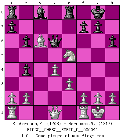 Last move : 1-0 2007 December 21 13:40:51 [Event "FICGS__CHESS__RAPID_C__000041"] [Site "FICGS"] [Date "2007.12.13"] [Round "1"] [White "Richardson,Patrick"] [Black "Barradas,Anderson"] [Result "1-0"] [WhiteElo "1203"] [BlackElo "1312"] 1.d4 d5 2.c4 Nf6 3.Nc3 e6 4.Bg5 Bb4 5.e3 O-O 6.Nf3 b6 7.cxd5 exd5 8.Bd3 Re8 9.Ne5 c5 10.O-O h6 11.Bxf6 Qxf6 12.Nxd5 Qd6 13.Nxb4 cxb4 14.Be4 Nc6 15.Bxc6 1-0 QGD : Marshall defense Kingside Castling by player Black (move 5) Kingside Castling by player White (move 10) Player White won this chess game. Follow this game move after move (download)Chess is above all, a fight ! (Emanuel Lasker) Es war undenkbar für die Behörden, dass ein sowjetischer Großmeister auf diese Art und Weise [Fischer-Taimanov 6:0] verliert, ohne dass es eine politischer Erklärung dafür gäbe. (Mark Taimanov) Cualquier cambio de material en una posición debe venir por medio de un mate, una captura o promoción de Peón. (Purdy) Ne tendez aucun piège pour le plaisir ! Ne jouez rien dans l'espoir que l'adversaire réagisse de façon stupide ! Prenez toujours pour acquis que l'adversaire va trouver le meilleur coup ! Ne jouez jamais de coup dans l'espoir que l'adversaire ne voie pas la menace ! Chacun de vos coups doit améliorer la position d'une façon ou d'une autre. Unless I accept my faults I will most certainly doubt my virtues. (Hugh Prather)