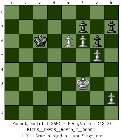 Last move : 1-0 2008 February 3 9:39:28 [Event "FICGS__CHESS__RAPID_C__000041"] [Site "FICGS"] [Date "2007.12.13"] [Round "1"] [White "Parmet,Daniel"] [Black "Hess,Volker"] [Result "1-0"] [WhiteElo "1365"] [BlackElo "1242"] 1.d4 d5 2.Nf3 Nc6 3.c4 dxc4 4.d5 Nb8 5.e4 Nf6 6.Nc3 e6 7.Bxc4 exd5 8.Nxd5 Nxd5 9.Bxd5 Be7 10.Qb3 O-O 11.Bxb7 Bxb7 12.Qxb7 Nd7 13.O-O Bd6 14.Qc6 Ne5 15.Nxe5 Bxe5 16.f4 Bd4+ 17.Kh1 Rb8 18.Rd1 Rb6 19.Qa4 Rd6 20.Qc2 Bb6 21.Bd2 Qa8 22.Bb4 Rxd1+ 23.Rxd1 Rd8 24.Rxd8+ Qxd8 25.Qd2 Qxd2 26.Bxd2 Kf8 27.g4 Ke7 28.Kg2 Ke6 29.Bc3 g6 30.g5 Be3 31.Kf3 Bc1 32.a4 Kd6 33.b4 c6 34.Be5+ Kd7 35.b5 cxb5 36.axb5 Bd2 37.Bd4 Kc7 38.Bxa7 Kb7 39.Bc5 Ba5 40.f5 Bb6 41.Bxb6 Kxb6 42.f6 Kxb5 43.e5 Kc6 44.e6 1-0 Queen's pawn game, Chigorin variation Kingside Castling by player Black (move 10) Kingside Castling by player White (move 13) 10 pieces endgame at move 41 : White KPPPPP , Black KPPP WHITE : King + 5 Pawns BLACK : King + 3 Pawns 9 pieces endgame at move 42 : White KPPPP , Black KPPP WHITE : King + 4 Pawns BLACK : King + 3 Pawns Player White won this chess game. Follow this game move after move (download)I play correspondence chess because it is both art and science while chess is art only. (A player at FICGS) Ich brauche nur einen Blick auf das Schachbrett zu werfen, und weiß schon, was in der Stellung steckt, was geschehen kann und was geschehen wird. Alle übrigen suchen und prüfen, ich aber weiß es! (José Raúl Capablanca) Mis oponentes también hacen buenas movidas. A veces yo no tomo esas cosas en consideración. (Bobby Fischer) Il vaut toujours mieux jouer un plan faux de façon logique que de n'avoir pas de plan du tout. (Victor Kortchnoï) There are 10 types of people in this world: those who understand binary and those who don't. (Anonymous)