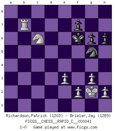 Last move : 1-0 2008 January 31 0:19:10 [Event "FICGS__CHESS__RAPID_C__000041"] [Site "FICGS"] [Date "2007.12.13"] [Round "1"] [White "Richardson,Patrick"] [Black "Brieler,Jay"] [Result "1-0"] [WhiteElo "1203"] [BlackElo "1289"] 1.d4 d5 2.c4 e6 3.Nc3 Nf6 4.Bg5 Be7 5.e3 O-O 6.Nf3 Nbd7 7.Rc1 b6 8.cxd5 exd5 9.Bd3 c5 10.O-O Bb7 11.Qe2 Rc8 12.Ba6 Bxa6 13.Qxa6 Re8 14.Qxa7 Ne4 15.Bxe7 Rxe7 16.Nxd5 Re6 17.Rfd1 Rd6 18.dxc5 Nexc5 19.g3 Ra8 20.Qc7 Qxc7 21.Nxc7 Rxd1+ 22.Rxd1 Rxa2 23.b4 h6 24.bxc5 Nxc5 25.Rd2 Ra1+ 26.Kg2 Rc1 27.Nd5 b5 28.Rb2 Rd1 29.Ne7+ Kf8 30.Nc6 Rd6 31.Nfd4 Ne6 32.Rxb5 g6 33.Ne5 Ng5 34.Rb7 Rf6 35.Nd7+ Kg7 36.Nxf6 Kxf6 37.Nc6 1-0 QGD : Orthodox defense, 7.Rc1 Kingside Castling by player Black (move 5) Kingside Castling by player White (move 10) Player White won this chess game. Follow this game move after move (download)The Pin is mightier than the sword. (Fred Reinfeld) Je mehr ich von der FIDE weiss, um so weniger verstehe ich. (Alexander Kalifman) Los finales de Peón son del Ajedrez lo que el cesped es del Golf. (Cecil Purdy) Toute estimation doit être constamment réévaluée. (Jacob Estrin) God is an atheist. (Unknown)