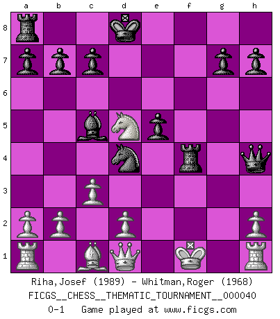 Last move : 0-1 2007 December 29 17:29:14 [Event "FICGS__CHESS__THEMATIC_TOURNAMENT__000040"] [Site "FICGS"] [Date "2007.12.13"] [Round "1"] [White "Riha,Josef"] [Black "Whitman,Roger"] [Result "0-1"] [WhiteElo "1989"] [BlackElo "1968"] 1.e4 e5 2.Nf3 Nc6 3.Bc4 Nf6 4.Ng5 Bc5 5.Bxf7+ Ke7 6.Bd5 Qe8 7.Nc3 Rf8 8.Nf3 Nd4 9.Nxe5 d6 10.Nd3 Bg4 11.f3 Bxf3 12.gxf3 Qh5 13.e5 Qh4+ 14.Kf1 Qh3+ 15.Ke1 Nxd5 16.Nxd5+ Kd8 17.N3f4 Nxf3+ 18.Ke2 Nd4+ 19.Ke1 Qh4+ 20.Kf1 dxe5 21.c3 Rxf4+ 0-1 Two knights defense : Wilkes Barre (Traxler) variation Player Black won this chess game. Follow this game move after move (download)You have to have the fighting spirit. You have to force moves and take chances. (Bobby Fischer) Ein Isolani verdüstert die Stimmung auf dem ganzen Schachbrett. (Savielly Grigorievitsch Tartakower) Nada excita más a Grandes Maestros aburridos que una novedad teórica. (Dominic Lawson) Il vaut toujours mieux jouer un plan faux de façon logique que de n'avoir pas de plan du tout. (Victor Kortchnoï) The mind is like a parachute, it only functions when its open. (Unknown)