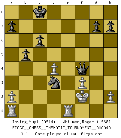 Last move : 0-1 2008 January 18 22:8:36 [Event "FICGS__CHESS__THEMATIC_TOURNAMENT__000040"] [Site "FICGS"] [Date "2007.12.13"] [Round "1"] [White "Inving,Yugi"] [Black "Whitman,Roger"] [Result "0-1"] [WhiteElo "0914"] [BlackElo "1968"] 1.e4 e5 2.Nf3 Nc6 3.Bc4 Nf6 4.Ng5 Bc5 5.Nxf7 Bxf2+ 6.Kf1 Qe7 7.Nxh8 d5 8.exd5 Nd4 9.d6 Qxd6 10.c3 Bg4 11.Qa4+ Nd7 12.Kxf2 Qf6+ 13.Ke1 O-O-O 14.cxd4 exd4 15.Nc3 Nc5 16.Qb5 dxc3 17.Be2 Qe7 18.d4 c6 19.Qc4 b5 20.Kf2 Rf8+ 21.Nf7 Rxf7+ 22.Qxf7 Qxf7+ 23.Bf3 Bxf3 24.gxf3 cxb2 25.Bxb2 Nd3+ 26.Ke2 Nxb2 27.Kf2 Qf4 28.Rhe1 Nd3+ 0-1 Two knights defense : Wilkes Barre (Traxler) variation Queenside Castling by player Black (move 13) Player Black won this chess game. Follow this game move after move (download)The tactician must know what to do whenever something needs doing; the strategist must know what to do when nothing needs doing. (Savielly Tartakover) Fischer machte Schach einfach zu einer aufregenden Sache, wann immer er sich ans Brett setzte. (Raymond Keene) Entre mas años cumplo, mas valoro los Peones. (Keres) Ce n'est pas pour s'amuser qu'il joue aux échecs : il célèbre un culte. (Vladimir Nabokov) I couldn't make any sense out of what this particular thread is about. It sounds like R2 D2 computer speaking. A space fight ?!? Some 'command' problems in Moscow ? Some killers & narcotic addicts attacking some game & a god wannabe ?? (Dinesh De Silva, lost in a russian conflict in FICGS forum)