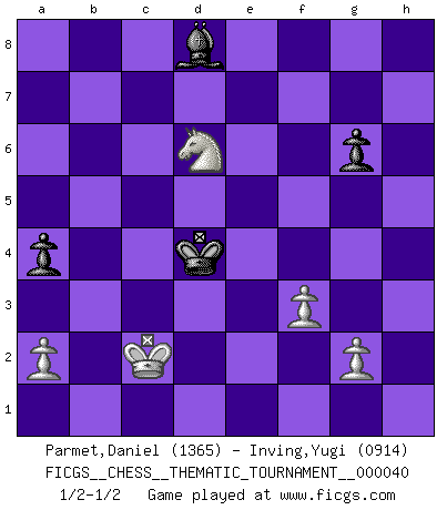 Last move : 1/2-1/2 2008 February 6 0:17:3 [Event "FICGS__CHESS__THEMATIC_TOURNAMENT__000040"] [Site "FICGS"] [Date "2007.12.13"] [Round "1"] [White "Parmet,Daniel"] [Black "Inving,Yugi"] [Result "1/2-1/2"] [WhiteElo "1365"] [BlackElo "0914"] 1.e4 e5 2.Nf3 Nc6 3.Bc4 Nf6 4.Ng5 Bc5 5.Nxf7 Qe7 6.Nxh8 Qf8 7.Nf7 d5 8.Bxd5 Nxd5 9.exd5 Qxf7 10.O-O Qxd5 11.Qh5+ Qf7 12.Qxf7+ Kxf7 13.c3 a5 14.d3 Bf5 15.Be3 Be7 16.d4 exd4 17.Bxd4 Nxd4 18.cxd4 Rd8 19.Nc3 Rxd4 20.Rad1 c5 21.Rfe1 Bc2 22.Rxd4 cxd4 23.Nd5 Bd6 24.Nb6 d3 25.Nc4 Bb4 26.Re4 b5 27.Ne5+ Kf6 28.Ng4+ Kf5 29.Rd4 Ke6 30.Ne3 Bc5 31.Re4+ Kd7 32.Nf1 d2 33.Nxd2 Bxe4 34.Nxe4 Bd4 35.b3 Kc6 36.Kf1 Kd5 37.f3 Be5 38.h4 Kd4 39.Ke2 a4 40.bxa4 bxa4 41.h5 g6 42.hxg6 hxg6 43.Kd2 Bc7 44.Kc2 Ba5 45.Nd6 Bd8 1/2-1/2 Two knights defense : Wilkes Barre (Traxler) variation Kingside Castling by player White (move 10) 10 pieces endgame at move 42 : White KNPPPP , Black KBPP WHITE : King + 1 Knight 4 Pawns BLACK : King + 1 Bishop 2 Pawns 9 pieces endgame at move 42 : White KNPPP , Black KBPP WHITE : King + 1 Knight 3 Pawns BLACK : King + 1 Bishop 2 Pawns This chess game ended in a draw. Follow this game move after move (download)Though most people love to look at the games of the great attacking masters, some of the most successful players in history have been the quiet positional players. They slowly grind you down by taking away your space, tying up your pieces, and leaving you with virtually nothing to do ! (Yasser Seirawan) Frage des Reporters: -Welche besonderen Umstände rechtfertigen das Anhalten der Uhren während einer Turnierpartie? Antwort: -Einen Fotographen zu strangulieren. (Siegbert Tarrasch) Cuando tengo las piezas blancas, yo gano porque soy blanco; Cuando tengo las piezas negras, yo gano porque soy Bogolyubov. (Bogolyubov) Comme les marins qui ont mille raisons différentes d'aller en mer, les joueurs d'échecs en ont tout autant avant de s'installer devant une table et jouer... (Vincent Bertignac, philosophe) Art disturbs, science reassures. (Georges Braque, Le Jour et la Nuit)