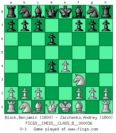 Last move : 0-1 2008 January 2 18:22:32 [Event "FICGS__CHESS__CLASS_B__000036"] [Site "FICGS"] [Date "2007.12.14"] [Round "1"] [White "Block,Benjamin"] [Black "Zaichenko,Andrey"] [Result "0-1"] [WhiteElo "1800"] [BlackElo "1800"] 1.e4 e5 2.Nf3 d6 3.d4 exd4 0-1 Philidor : Exchange variation Player Black won this chess game. Follow this game move after move (download)War is the child of passion, passion is the child of narcissism and narcissism is the child. (...) Another game ? (Thibault de Vassal) Man kann eine Schachpartie nur gewinnen, wenn das Gleichgewicht gestört ist. In einer Stellung mit ungestörtem Gleichgewicht ist auch das größte Genie hilflos - in der Stellung steckt dann eben kein genialer Einfall. (Wilhelm Steinitz) A la fecha, Fischer esta simplemente un nivel arriba de todos los mejores jugadores de Ajedrez del mundo. (John Jacobs) Avec des compensations pour le matériel en plus... (Anonyme) Locking firmely the window serves nothing, only small thiefs pass through there, the big thiefs enter through the front door. (Luc-Olivier Leclerc)