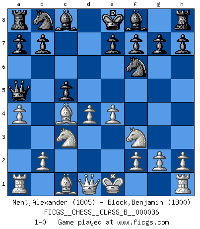 Last move : 1-0 2008 January 3 13:45:23 [Event "FICGS__CHESS__CLASS_B__000036"] [Site "FICGS"] [Date "2007.12.14"] [Round "1"] [White "Nent,Alexander"] [Black "Block,Benjamin"] [Result "1-0"] [WhiteElo "1805"] [BlackElo "1800"] 1.d4 d5 2.c4 c6 3.Nf3 Nf6 4.Nc3 dxc4 5.a4 c5 6.e4 Qa5 7.Bxc4 1-0 QGD Slav accepted : Alapin variation Player White won this chess game. Follow this game move after move (download)I give 98 percent of my mental energy to Chess. Others give only 2 percent. (Bobby Fischer) Wenn sie aufgeben, dann danke ich Ihnen für das Spiel (Eventualzug beim Fernschach). (Anonymous) El Ajedrez no es como la vida... ¡tiene reglas!. (Mark Pasternak) La conception d'un plan est le processus par lequel un joueur exploite les avantages de sa position tout en s'efforçant d'en réduire au minimum les inconvénients. Afin de garantir le succès, un plan doit toujours se fonder sur un diagnostic objectif des particularités d'une position. La conception d'un plan est d'autant plus difficile que la position est équilibrée, et grandement facilitée lorsqu'il n'existe qu'un seul plan susceptible de répondre aux exigences de la position. (Harry Golombek) Without deviation from the norm, progress is not possible. (Frank Zappa)