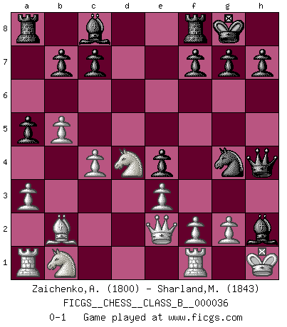 Last move : 0-1 2008 February 10 16:9:9 [Event "FICGS__CHESS__CLASS_B__000036"] [Site "FICGS"] [Date "2007.12.14"] [Round "1"] [White "Zaichenko,Andrey"] [Black "Sharland,Michael"] [Result "0-1"] [WhiteElo "1800"] [BlackElo "1843"] 1.b4 e5 2.a3 d5 3.Bb2 a5 4.b5 Bd6 5.Nf3 Nd7 6.e3 Ngf6 7.c4 e4 8.Nd4 O-O 9.Be2 dxc4 10.Bxc4 Ne5 11.Qe2 Nfg4 12.d3 Qf6 13.O-O Nxc4 14.dxc4 Bxh2+ 15.Kh1 Qh4 0-1 Polish (Sokolsky) opening Kingside Castling by player Black (move 8) Kingside Castling by player White (move 13) Player Black won this chess game. Follow this game move after move (download)Who is your opponent tonight, tonight I am playing against the Black pieces. (Akiba Rubinstein) Bogoljubow: Matt in vier Zügen! Tartakower: Ich verbitte mir jede Belästigung! (Savielly Grigorievitsch Tartakower) Solo puedes ser bueno en el Ajedrez si amas al juego. (Bobby Fischer) Les échecs sont plus proches de l'art de l'assassinat que de l'art de la guerre. (Arturo Perez-Reverte) Dave, my mind is going. I can feel it. (HAL 9000 in 2001, a space odyssey)